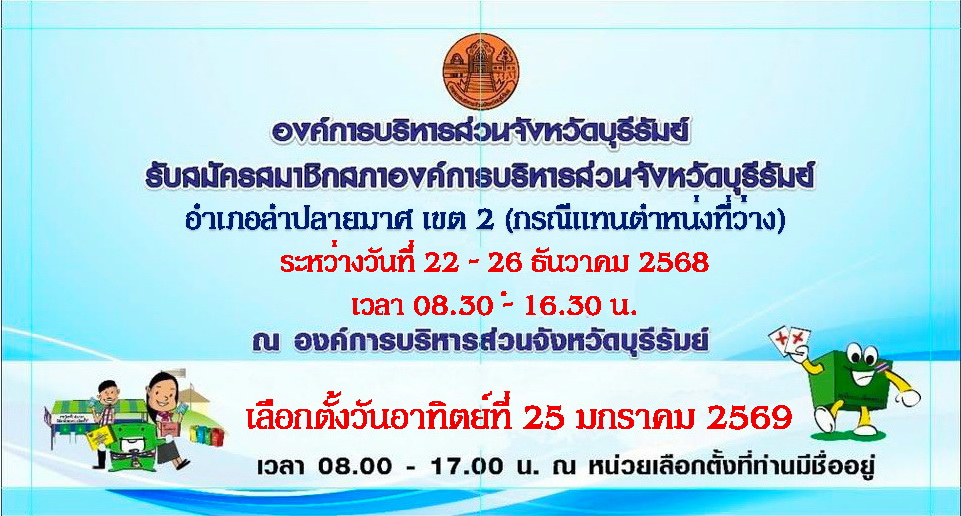 ![]() รับสมัครเลือกตั้งสมาชิกสภาองค์การบริหารส่วนจังหวัดบุรีรัมย์ เขตอำเภอลำปลายมาศ เขต 2 (กรณีแทนตำแหน่งวันที่ 22 ธันวาคม 2568 คณะกรรมการการเลือกตั้งประจำองค์การบริหารส่วนจังหวัดบุรีรัมย์ ตรวจเยี่ยมและให้กำลังใจเจ้าหน้าที่ อบจ.บุรีรัมย์ ในการรับสมัครเลือ... รายละเอียดเพิ่มเติม... |